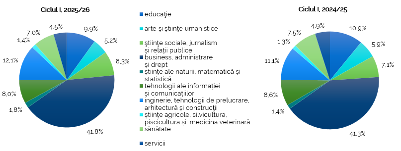 Asemănător anului de studii 2024/25, la nivelul ciclului I, există domenii cu un număr mare de studenți înmatriculați (business, administrare și drept7 (41,8%), inginerie, tehnologii de prelucrare, arhitectură și construcții (12,1%), educație (9,9%)), precum și altele cu un număr redus (ştiinţe agricole, silvicultura, piscicultura și medicina veterinară (1,4%), ştiinţe ale naturii, matematică și statistică (1,8%)). Totodată, comparativ cu anul de studii 2024/25, se remarcă schimbări în structura pe domenii, și anume ponderi în creștere la domeniile ştiinţe sociale, jurnalism și relații publice (+1,2 p.p.8, inginerie, tehnologii de prelucrare, arhitectură și construcţii (+1,0 p.p.), precum și ponderi mai mici pentru domeniile educație (-1,0 p.p.), arte şi ştiinţe umanistice (-0,7 p.p.) (Figura 1).
