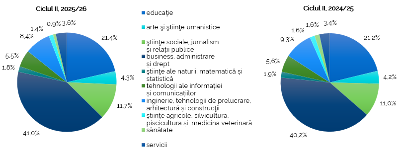 La ciclul II, s-au menținut ponderi mai ample la domeniile business, administrare și drept (41,0% din total înmatriculați, în creșetre cu 0,8 p.p. față de anul de studii 2024/25) și educație (21,4%, sau +0,2 p.p.). În același timp, cele mai mari descreșteri a ponderii celor înmatriculați la ciclul II s-au înregistrart la domeniile inginerie, tehnologii de prelucrare, arhitectură și construcţii (-0,9 p.p. față de anul de studii 2024/25) și sănătate (-0,7 p.p.) (Figura 2).