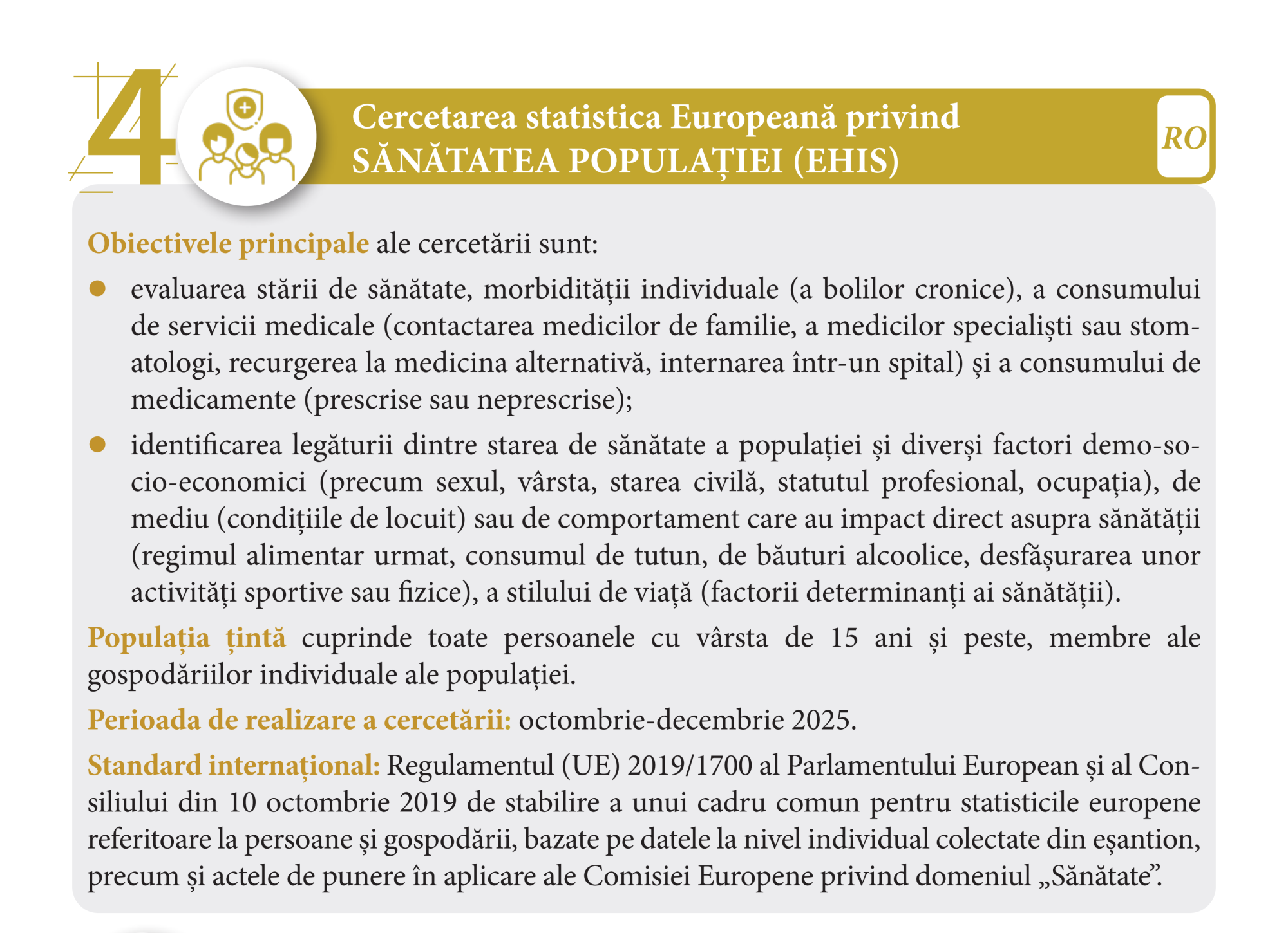 - Colectarea datelor are loc prin interviu față-în-față cu membrii gospodăriei de la 15 ani și peste, cu înregistrarea răspunsurilor (de către operatorul de interviu) pe dispozitive electronice (tablete);