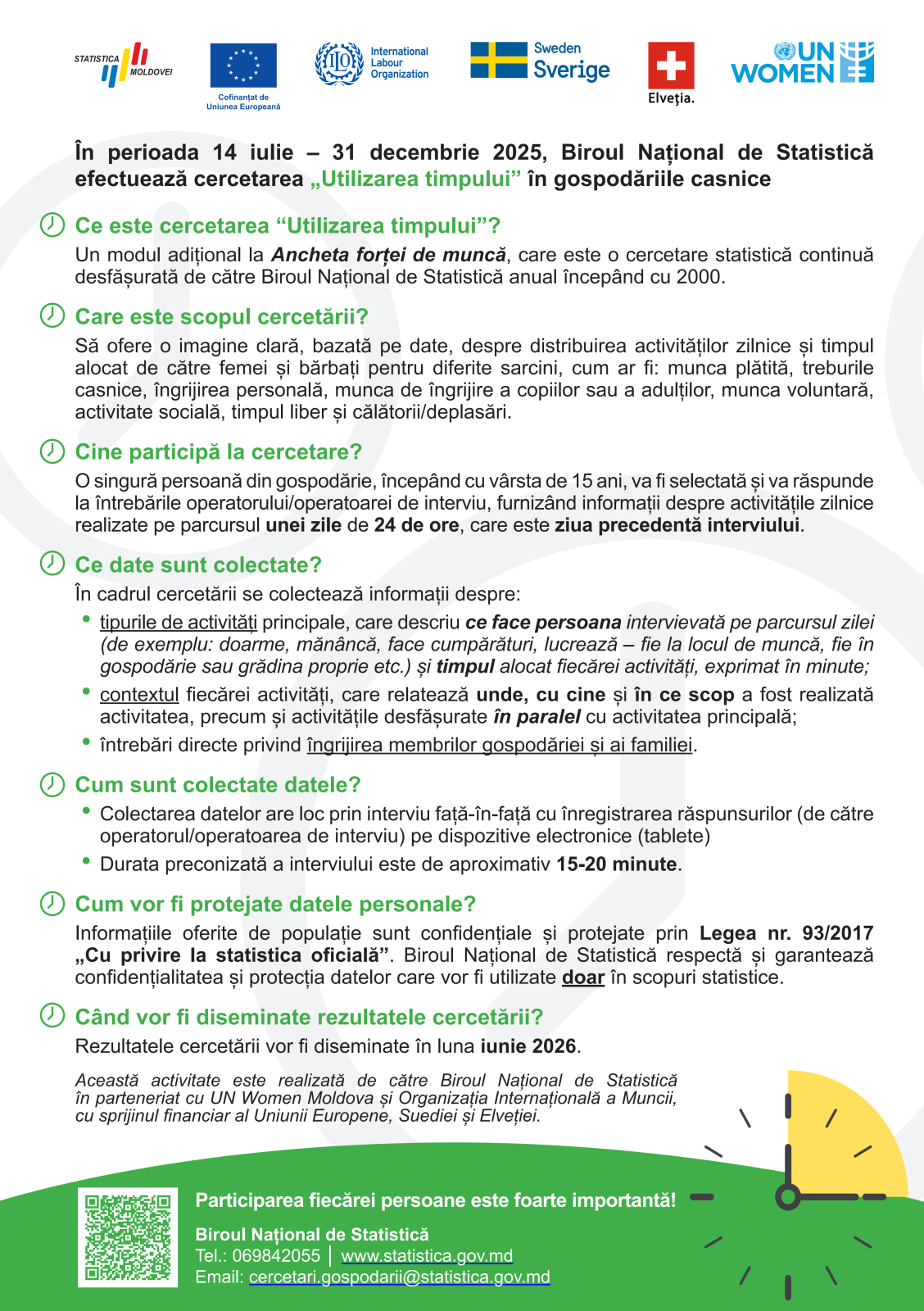 Această activitate este realizată de către Biroul Național de Statistică în parteneriat cu UN Women Moldova și Organizația Internațională a Muncii, cu sprijinul financiar al Uniunii Europene, Suediei și Elveției.