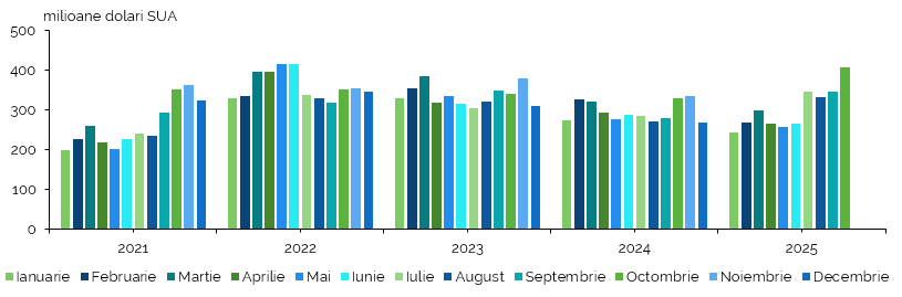 Figura 1. Evoluția lunară a exporturilor de mărfuri, în anii 2021-2025 (milioane dolari SUA)