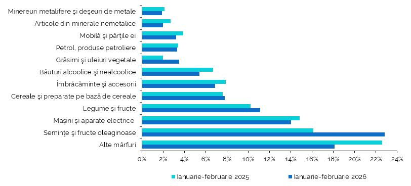 În structura exporturilor din ianuarie-februarie 2026 (Figura 6 și Anexa 6) ponderi semnificative le-au revenit următoarelor grupe de mărfuri: semințe și fructe oleaginoase (22,8% din total exporturi); mașini și aparate electrice și părți ale acestora (14,0%); legume și fructe (11,1%); cereale și preparate pe bază de cereale (7,8%); îmbrăcăminte și accesorii (6,9%); băuturi alcoolice și nealcoolice (5,4%); grăsimi și uleiuri vegetale (3,5%); petrol, produse petroliere și produse înrudite (3,3%); mobilă și părțile ei (3,2%); articole din minerale nemetalice (2,0%); minereuri metalifere și deșeuri de metale (1,9%).
