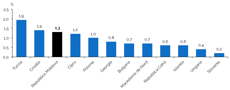 Republica Moldova, înregistrând creșterea medie a prețurilor de consum în martie 2026 față de martie 2025 cu 5,8%, a fost sub nivelul marcat în Turcia (30,9%) și a depășit creșterea prețurilor marcată în alte țări analizate: Islanda (5,4%), Macedonia de Nord (4,9%), Croația (4,8%), Georgia (4,3%), Bulgaria (3,9%), Estonia (3,6%), Polonia (3,0%), Slovenia (2,5%), Republica Cehă (1,9%), Ungaria (1,8%).