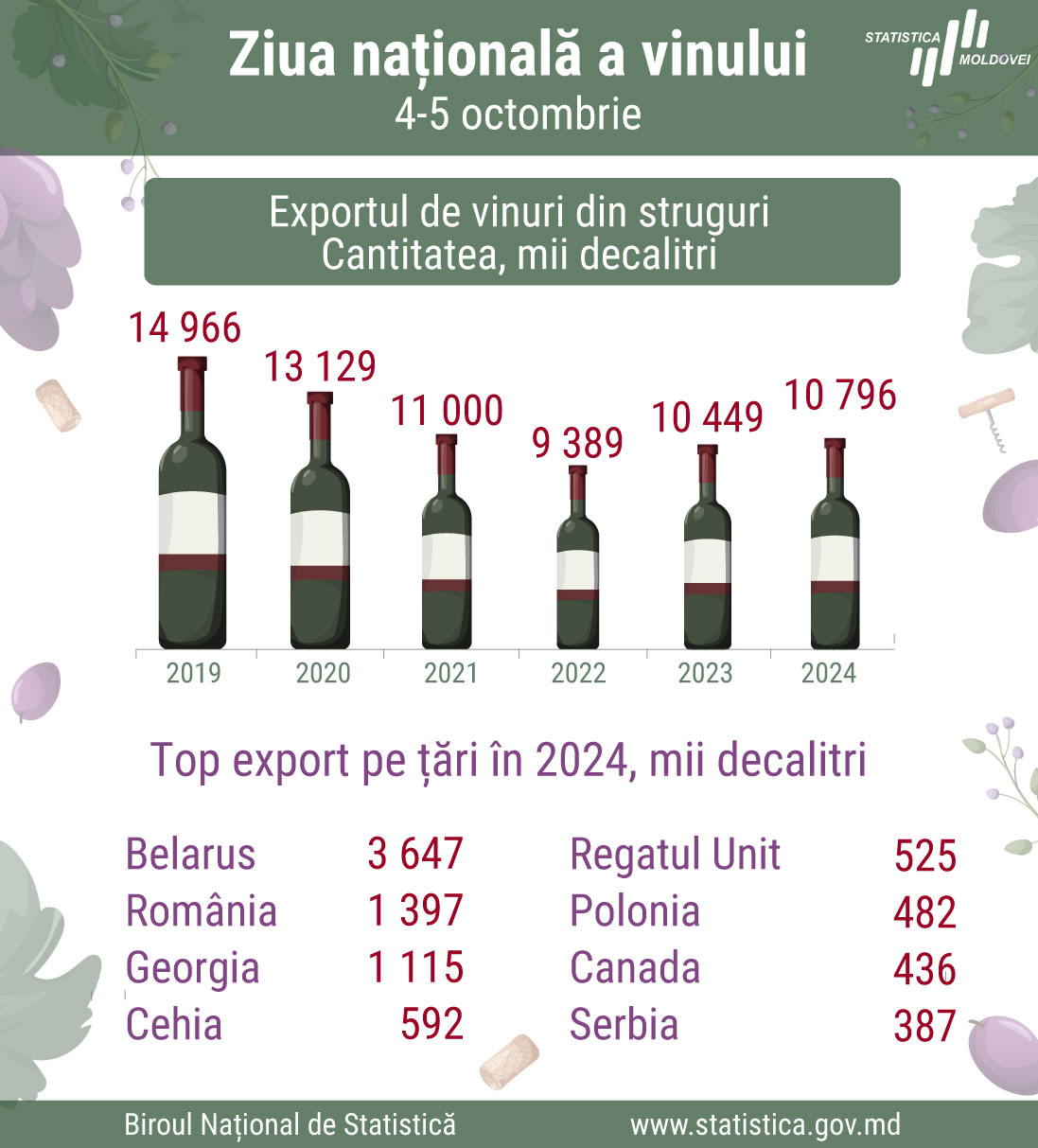 Cu această ocazie, Biroul Național de Statistică invită să descoperiți, prin infografice, povestea vinului moldovenesc spusă în cifre – de la producție până la export.