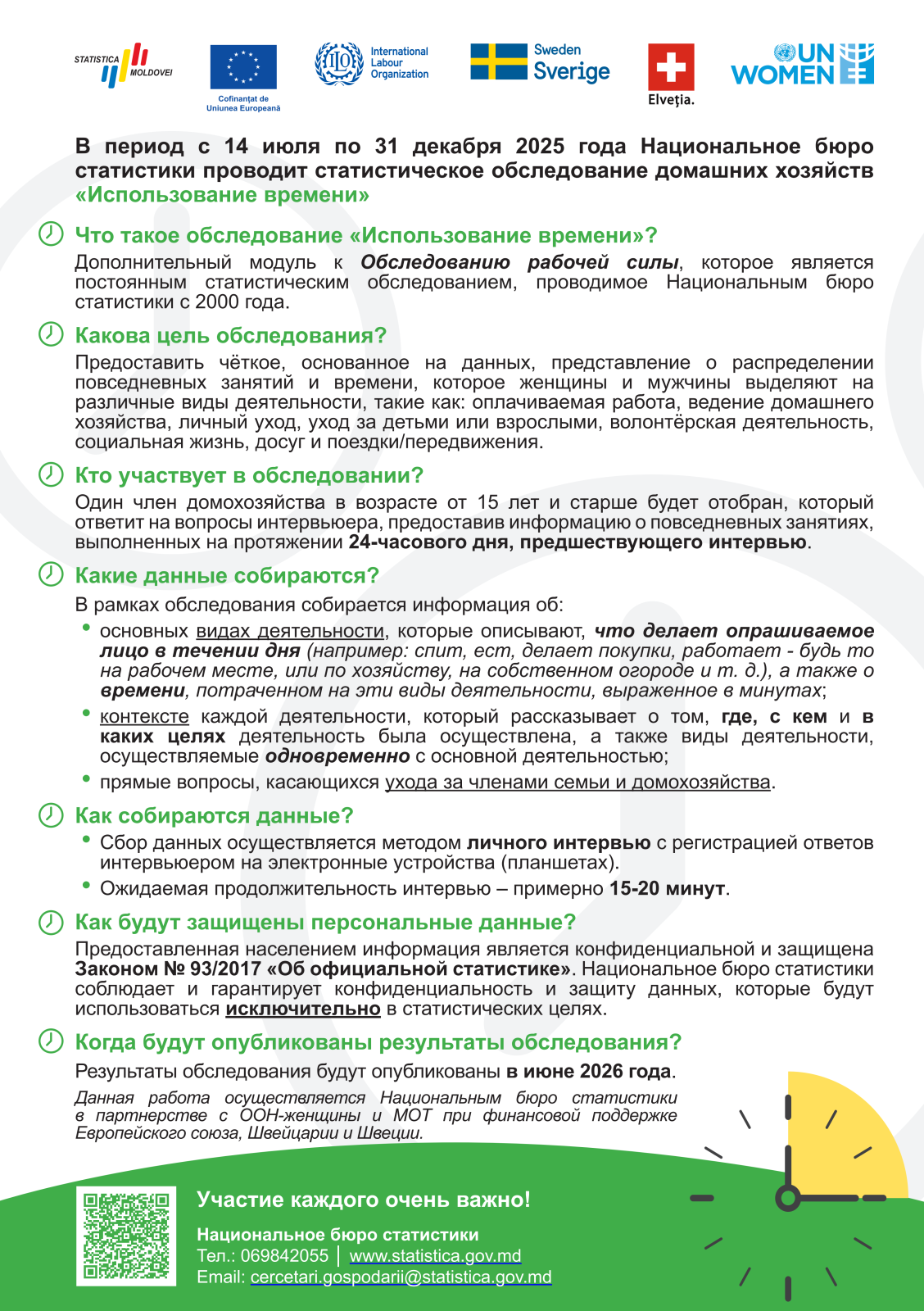 Данная работа осуществляется Национальным бюро статистики в партнерстве с ООН-женщины и МОТ при финансовой поддержке Европейского союза, Швейцарии и Швеции.