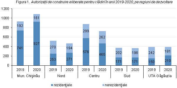 În profil regional în anul 2020 autorizaţiile de construire eliberate pentru clădirile rezidenţiale au crescut în mun. Chișinău cu 186 autorizații (cu 25,1%), în UTA Găgăuzia – cu 60 autorizații (cu 40,0%) și în regiunea de dezvoltare Nord – cu 18 autorizații (cu 7,1%). În regiunea de dezvoltare Centru s-au eliberat cu 111 autorizații de construire (cu 19,3%) mai puțin față de anul precedent, iar pentru regiunea de dezvoltare Sud indicatorul a rămas la nivelul anului 2019.