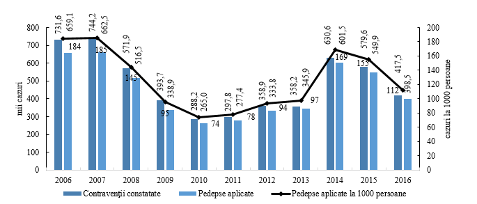 În anul 2016 au fost constatate 417,5 mii contravenţii, cu 28,0% mai puţin comparativ cu anul precedent. Pentru majoritatea cazurilor de contravenţii constatate au fost aplicate pedepse (95,4%). Din numărul total al hotărîrilor adoptate, 5,3 mii (1,3%) au fost transmise organelor de cercetare prealabilă (penală), dat fiind faptul că în acţiunile contravenţiilor se conţinea indiciul infracţiunii. În medie, la 1000 persoane revin 112 cazuri de contravenţii constatate însoţite de aplicarea pedepselor.