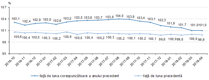 | Aprilie 2018 în % faţă de: | Informativ: aprilie 2017 în % faţă de aprilie 2016 | ||