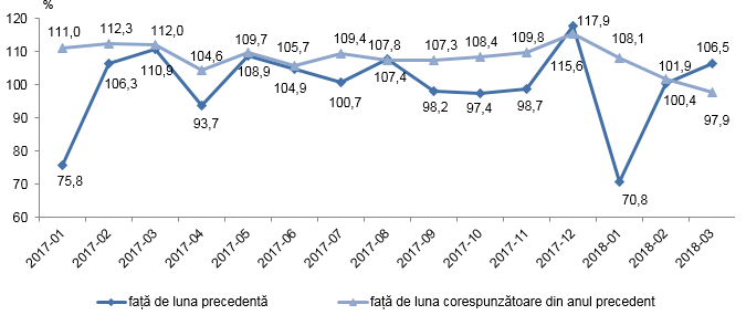 Biroul Naţional de Statistică anunţă că în luna martie 2018 cifra de afaceri din comerţul cu amănuntul (cu excepţia comerţului cu autovehicule şi motociclete) a înregistrat o creștere de 11,7% (în preţuri comparabile) faţă de luna precedentă şi de 0,1%, comparativ cu luna martie 2017.