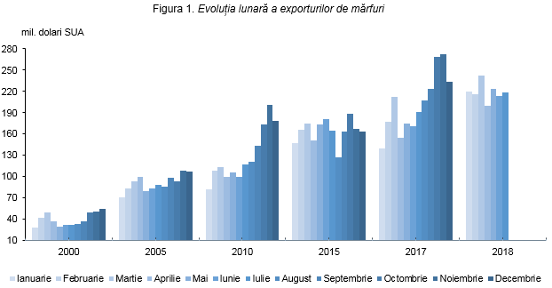 În ianuarie-iulie 2018 exporturile de mărfuri au totalizat 1534,1 mil. dolari SUA, volum superior celui realizat în perioada corespunzătoare din anul 2017 cu 25,8%.