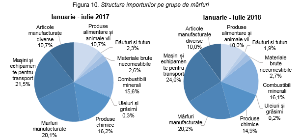 În ianuarie-iulie 2018, comparativ cu aceeași perioadă din anul 2017, au sporit importurile de petrol, produse petroliere și produse înrudite (+40,6%), mașini și aparate electrice și părți ale acestora (+46,7%), mașini și aparate specializate pentru industriile specifice (+51,3%), vehicule rutiere (+28,5%), gaz și produse industriale obținute din gaz (+32,4%), legume și fructe (+45,9%), aparate și echipamente de telecomunicații și pentru înregistrarea și reproducerea sunetului și imaginii (+48,1%), fier și oțel (+41,0%), fire, țesături și articole textile și produse conexe (+14,4%), articole prelucrate din metal (+31,0%), mașini și aparate industriale cu aplicații generale (+24,5%), metale neferoase (+44,9%), îmbrăcăminte și accesorii (+17,0%), îngrășăminte minerale sau chimice (+31,5%), piele și blană prelucrate (+50,9%), articole din lemn (+34,3%), materiale plastice prelucrate (+18,3%), hârtie, carton și articole din pastă de celuloză, din hârtie sau din carton (+20,2%), cereale și preparate pe bază de cereale (+24,2%), produse medicinale și farmaceutice (+6,9%), mașini și aparate de birou sau pentru prelucrarea automată a datelor (+38,8%), cauciuc prelucrat (+27,7%), semințe și fructe oleaginoase (+34,9%), mașini generatoare de putere și echipamentele lor (de 1,8 ori), instrumente și aparate, profesionale, științifice și de control (+26,6%), carne și preparate din carne (+35,3%), băuturi alcoolice și nealcoolice (+20,0%), articole din minerale nemetalice (+8,3%), pește, crustacee, moluște (+17,9%), hrană destinată animalelor (+23,4%), mobilă și pârțile ei (+15,2%), materiale plastice sub forme primare (+13,5%), cafea, ceai, cacao, condimente și înlocuitori ai acestora (+13,9%), produse tanante și colorante (+18,6%), produse lactate și ouă de păsări (+10,6%), construcții prefabricate; alte instalații și accesorii pentru instalații sanitare, de încălzit și de iluminat (+15,4%), îngrășăminte naturale și minerale naturale (+49,7%), facilitând astfel creșterea pe total importuri cu 24,1%.