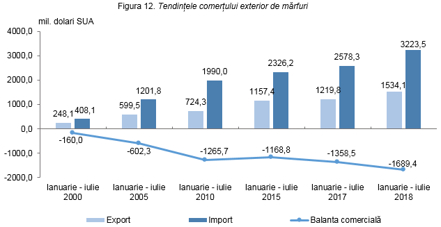Decalajul considerabil în evoluția exporturilor și importurilor Republicii Moldova a determinat acumularea în ianuarie-iulie 2018 a unui deficit al balanței comerciale în valoare de 1689,4 mil. dolari SUA, cu 330,9 mil. dolari SUA (+24,4%) mai mare, comparativ cu cel înregistrat în perioada corespunzătoare din anul 2017.