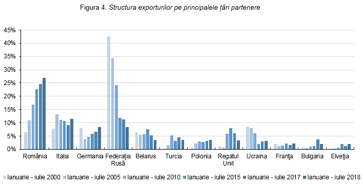 Analiza evoluției exporturilor pe țări în ianuarie-iulie 2018, comparativ cu perioada similară din anul 2017, relevă majorarea exporturilor în România (+37,4%), Italia (de 1,6 ori), Germania (de 1,6 ori), Elveția (de 2,1 ori), Polonia (+34,3%), Franța (de 1,7 ori), Ucraina (+33,7%), Serbia (de 3,7 ori), Olanda (de 1,7 ori), Portugalia (de 139,7 ori), Grecia (de 1,6 ori), Slovacia (de 2,4 ori), Austria (+38,4%), Republica Cehă (+39,5%), Spania (de 1,6 ori), Emiratele Arabe Unite (de 4,7 ori), Liban (de 1,8 ori), Statele Unite ale Americii (+28,7%), China (+30,7%), Georgia (+19,8%), Arabia Saudită (de 1,9 ori), Belgia (+27,6%), Myanmar (de 5,2 ori), Lituania (+23,7%), Letonia (+36,2%), Indonezia (+44,5%), Thailanda (de 5,1 ori), Maroc (de 3,2 ori), care a favorizat creșterea pe total exporturi cu 30,8%.