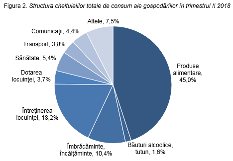 Cea mai mare parte a cheltuielilor tradițional este destinată necesarului de consum alimentar – 45,0% (44,3% în trimestrul II 2017). Pentru întreținerea locuinței o persoană în medie a alocat 18,2% din cheltuielile totale de consum (- 0,2 p.p. față de trimestrul II 2017), iar pentru îmbrăcăminte și încălțăminte – 10,4% (nivelul trimestrului II 2017). Celelalte cheltuieli au fost direcționate pentru sănătate – 5,4%, comunicații – 4,4%, transport – 3,8%, dotarea locuinței – 3,7%, învățământ – 0,4%, etc. Structura acestor cheltuieli nu s-a schimbat esențial comparativ cu perioada respectivă a anului precedent. În medie, cheltuielile de consum ale populației din mediul urban au constituit 2746 lei pe o persoană lunar, respectiv cu 652 lei sau de 1,3 ori mai mult față de mediul rural.