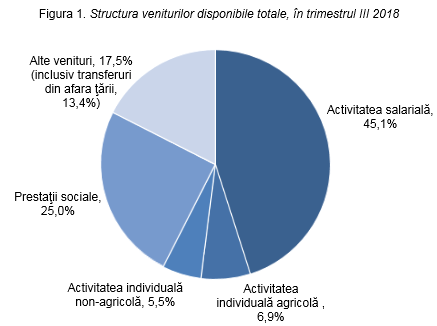 La formarea veniturilor totale ale gospodăriilor au contribuit de asemenea prestațiile sociale în proporție de 25,0% (cu 0,8 puncte procentuale mai puțin față de trimestrul III 2017), precum și veniturile obținute din activitățile pe cont propriu, 12,4% din veniturile populației, inclusiv 6,9% sunt veniturile din activitatea individuală agricolă, iar 5,5% sunt cele din activitatea individuală non-agricolă. O pondere importantă dețin transferurile bănești din afara țârii, contribuția acestora fiind de 13,4% din total venituri.