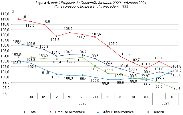 Preţurile medii de consum în luna februarie 2021 faţă de luna ianuarie 2021 au crescut cu 0,38% (informativ: în luna februarie 2020 faţă de ianuarie 2020 acestea s-au diminuat cu 0,02%). Creșterea preţurilor medii de consum a fost determinată de creșterea preţurilor la produsele alimentare cu 0,92 la sută și la mărfurile nealimentare cu 0,79 la sută (Tabelul 1).