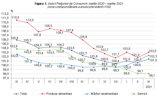 Preţurile medii de consum în luna martie 2021 faţă de luna februarie 2021 au crescut cu 0,96% (informativ: în luna martie 2020 faţă de februarie 2020 acestea au crescut cu 0,09%). Creșterea preţurilor medii de consum a fost determinată de creșterea preţurilor la produsele alimentare cu 1,56 la sută, la mărfurile nealimentare cu 0,98 la sută și la serviciile prestate populației cu 0,09 la sută (Tabelul 1).