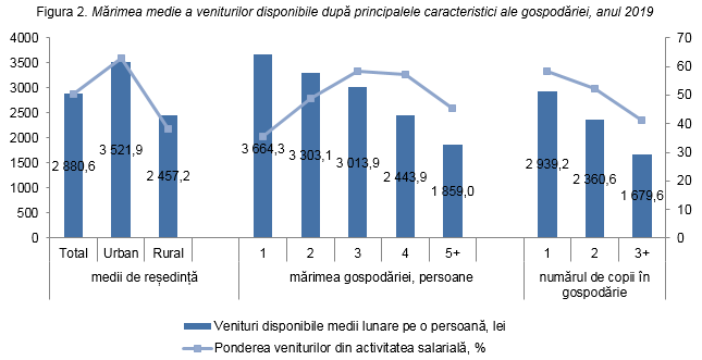 Gospodăriile formate dintr-o singură persoană au dispus de venituri de 2 ori mai mari comparativ cu cele din 5 şi mai multe persoane. Aceeaşi tendinţă este înregistrată şi în funcţie de numărul de copii în gospodărie. Totodată, ponderea veniturilor din activitatea salarială este maximală în cazul gospodăriilor formate din 3-4 persoane. Dacă ne referim la gospodăriile cu copii, atunci veniturile salariale deţin o pondere mai mică în cazul celor cu 3 şi mai mulţi copii.