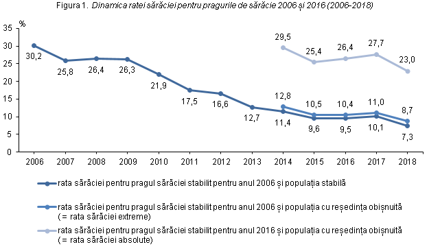 Figura 1 arată evoluția ratei sărăciei, pentru două praguri diferite ale sărăciei (cel inițial stabilit în 2006 și altul revizuit pentru 2016) cu aplicarea coeficienților de extindere bazați pe estimările populației stabile și ale populației cu reședința obișnuită. În consecință în grafic sunt reprezentate 3 opțiuni ale ratei sărăciei, diferite după conținutul metodologic.