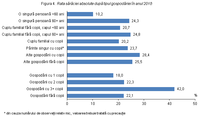 Un interes sporit prezintă analiza ratei sărăciei după tipul gospodăriei. Indicatorii respectivi pentru anul 2018 sunt prezentați în Figura 4. Astfel, rata sărăciei variază semnificativ, cea mai scăzută pondere (10,2%) s-a înregistrat la gospodăriile formate dintr-un singur membru în vârstă de până la 60 ani, iar cea mai ridicată la gospodăriile cu trei sau mai mulți copii (42,0%). Acest grup de gospodării reprezintă aproximativ 8% din populație. Rata sărăciei pentru gospodăriile monoparentale cu copii este neobișnuit de scăzută în anul 2018, dar numărul de observații este relativ mic, astfel încât estimările ar trebui tratate cu precauție.