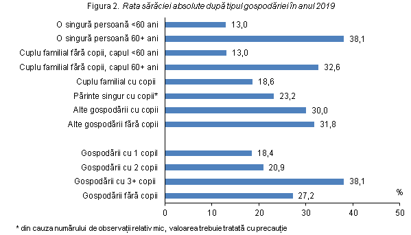 În funcție de tipul gospodăriei, cele mai scăzute rate ale sărăciei s-au înregistrat la gospodăriile formate dintr-un singur membru în vârstă de până la 60 ani și la gospodăriile formate din cuplu familial fără copii cu capul gospodăriei în vârstă de până la 60 ani (13,0%). Cea mai ridicată rata (38,1%) s-a înregistrat la gospodăriile formate dintr-un singur membru în vârstă de 60 de ani și peste, precum și la gospodăriile cu trei sau mai mulți copii. Rata sărăciei în gospodăriile monoparentale este mai mare decât în rândul cuplurilor cu copii, dar numărul de observații este relativ mic, astfel încât estimările ar trebui tratate cu precauție (Figura 2).