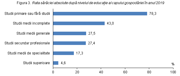 Sărăcia variază și în funcție de nivelul de educație al capului gospodăriei și, respectiv, probabilitatea de a fi sărac este mai mică în cazul gospodăriilor cu un nivel mai înalt de instruire al principalului întreținător. Fiecare nivel de educație în plus al capului gospodăriei înseamnă o scădere a ratei sărăciei, de la 78,3% pentru gospodăriile unde capul gospodăriei are studii primare sau nu are studii, până la 4,6% în cazul gospodăriilor unde capul gospodăriei are studii superioare (Figura 3).