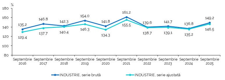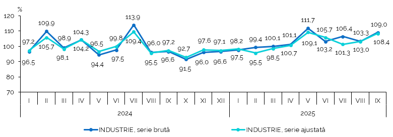 În luna septembrie 2025, producția industrială ca serie ajustată în funcție de numărul de zile lucrătoare și de sezonalitate s-a majorat cu 8,4% față de luna septembrie a anului precedent, ca efect al creșterii producției în industria extractivă (+14,7%), în industria prelucrătoare (+9,1%) și la producția și furnizarea de energie electrică și termică, gaze, apă caldă și aer condiționat (+4,4%).
