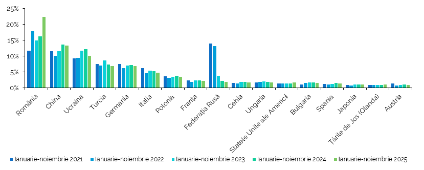 În ianuarie-noiembrie 2025 în topul țărilor de origine a importurilor de mărfuri (Figura 11 și Anexa 2) s-au regăsit: România (22,5% din total importuri), China (13,5%), Ucraina (10,2%), Turcia (7,0%), Germania (6,9%), Italia (4,8%), Polonia (3,5%), Franța (2,3%), cărora le-au revenit 70,8% din total importuri.