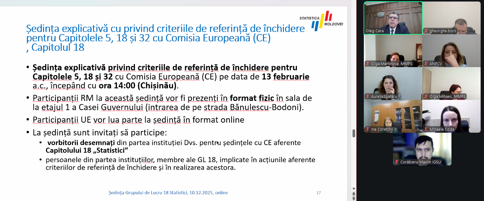 În cadrul ședinței ordinare din 4 februarie a Grupului de lucru (GL) nr. 18 „Statistici”, convocată de Biroul Național de Statistică (BNS) în calitate de instituție coordonatoare, au fost abordate mai multe subiecte de actualitate privind procesul de integrare europeană în domeniul statistic.