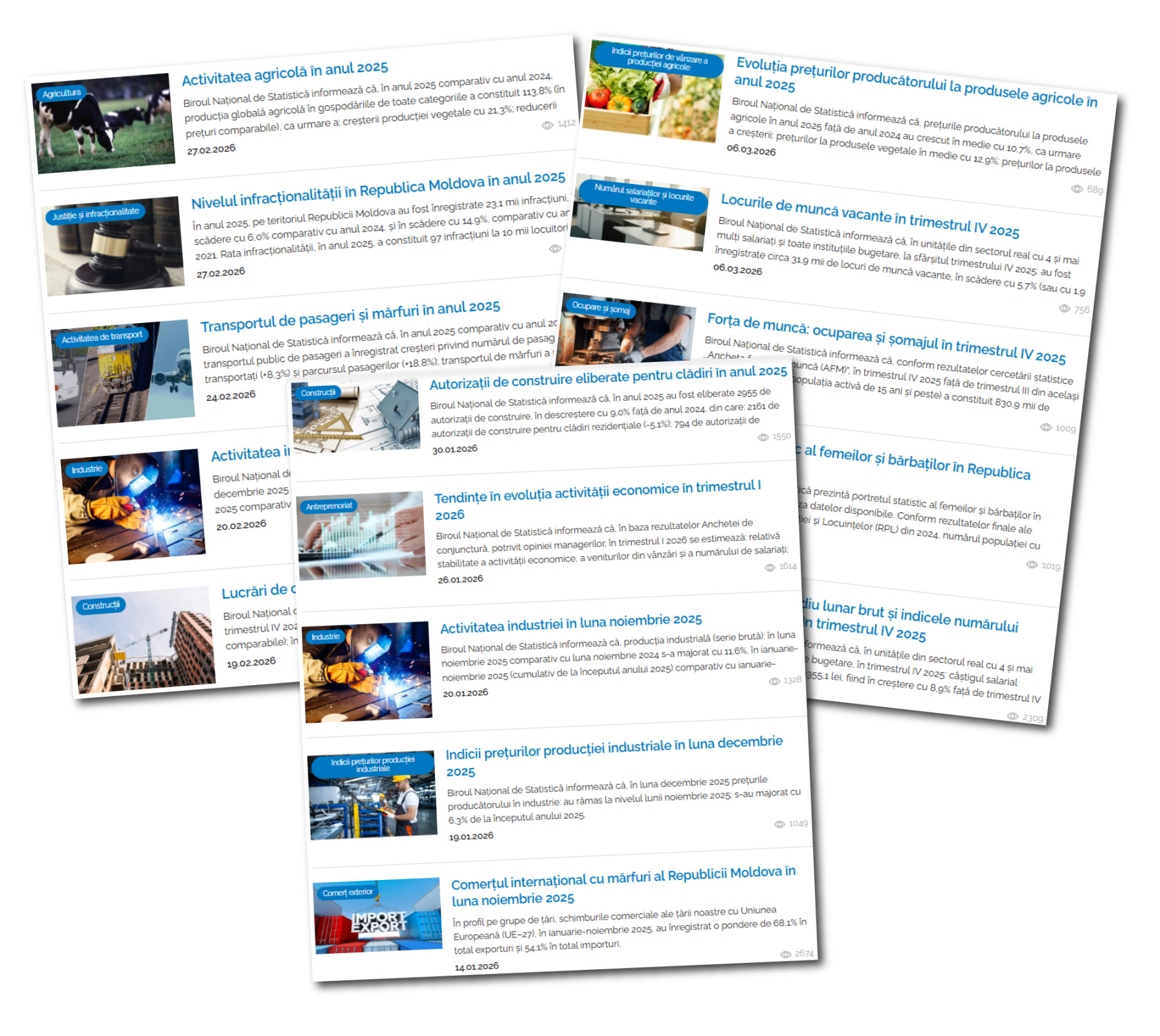 În trimestrul I 2026 Biroul Național de Statistică a elaborat și diseminat 27 de comunicate care prezintă cele mai recente date statistice pentru toate domeniile de activitate social-economică din țară, conform calendarului de diseminare a informațiilor statistice în anul 2026. Vedeți comunicatele