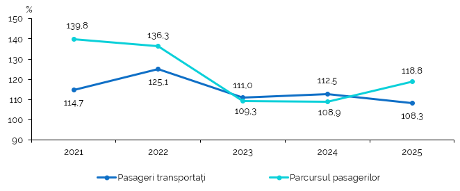 În anul 2025, cu transportul public au fost transportați 333,0 milioane pasageri, în creștere cu 8,3% față de anul 2024. Această evoluție a fost determinată de majorarea numărului de pasageri transportați cu transportul aerian (+37,3%), electric (+8,4%), rutier (+7,9%) și fluvial (+2,3%). Totodată, numărul pasagerilor transportați cu transportul feroviar a înregistrat descreșteri cu 51,4% comparativ cu anul 2024.